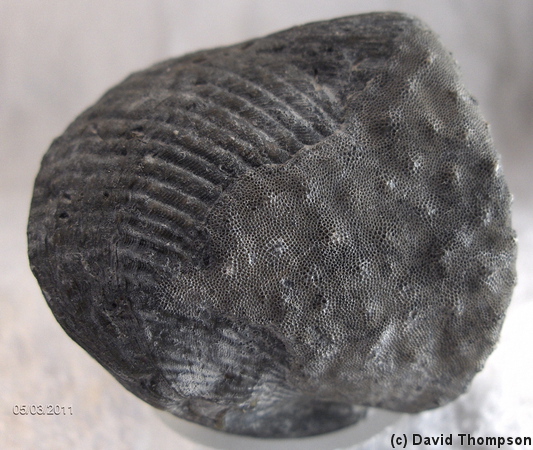 Submitter notes: This view shows the edge of the encrusting bryozoan on the top of the Brachiopod. The Brachiopod is 4.4 cm long by