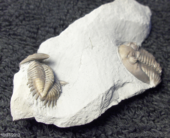 Submitter notes: Two Greenops widderensis on one plate. Both are complete but one has the head rolled under the body and is partly disarticulated. The largest has the complete tail on the reverse shown in another view in this group. The largest is 1.9 cm wide at the cheeks and would be about 3.5 cm or 1.4 inches long if laid flat. The disarticulate one is almost the same width but length is hard to measure.