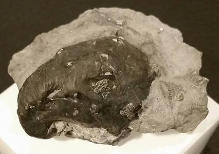 This snail would have been covered in long spines in life. Only the base of the spines are preserved in this specimen. Occasionally the spines are preserved and revealed with very careful preparation.