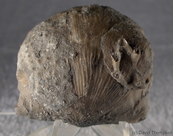 Submitter notes: This coral is encrusting a brachiopod. The brachiopod specimen is 5.5 cm across. This specimen is a hypotype.