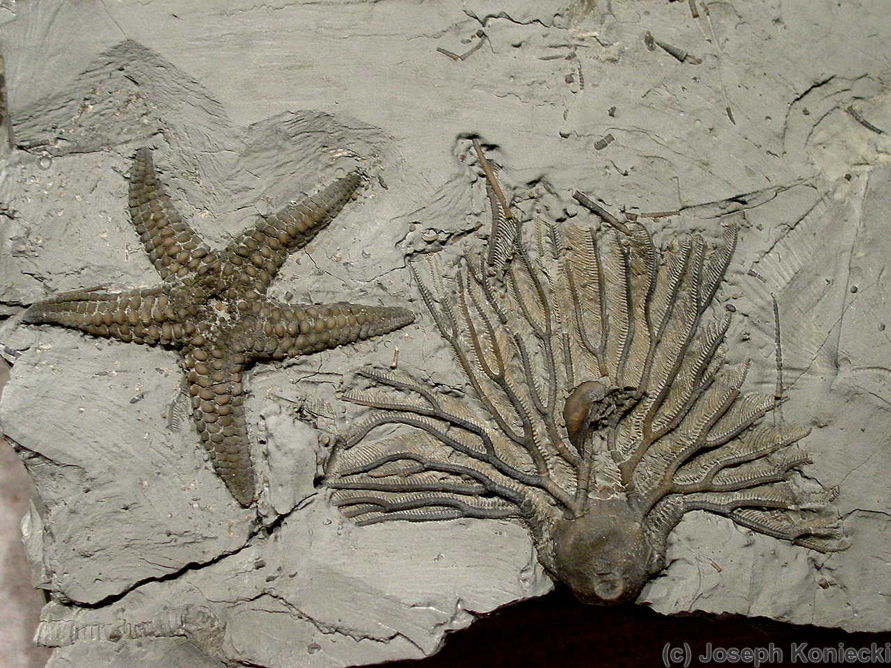 Submitter notes: The slab is about 10 cm across. The Arthroacantha crinoid has regenerating arms.
