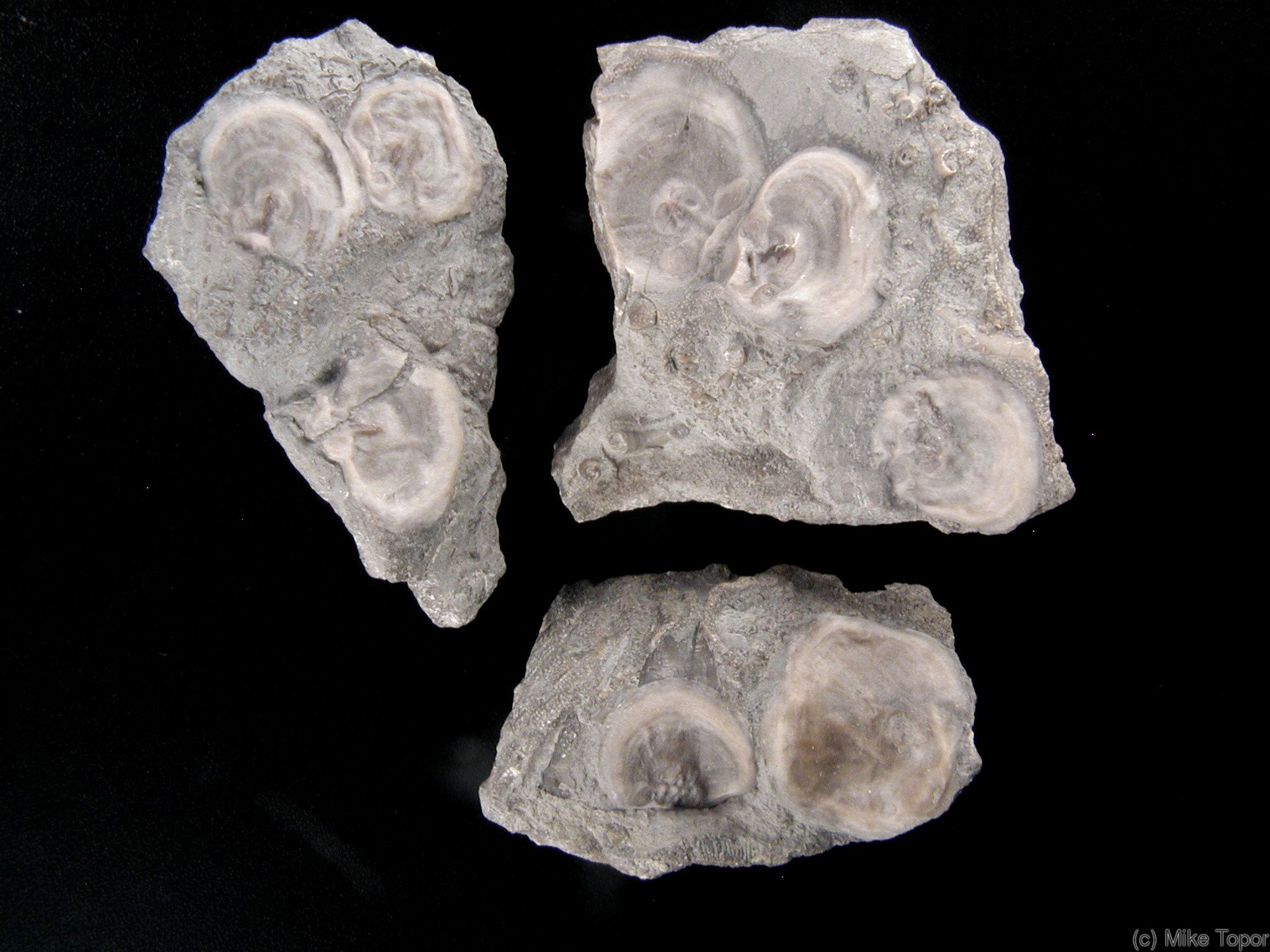 Submitter notes: This brachiopod is common in the formation. They attach to many different species of corals. All are single valves. The largest brachiopod in the photo measures 41mm X 34mm.